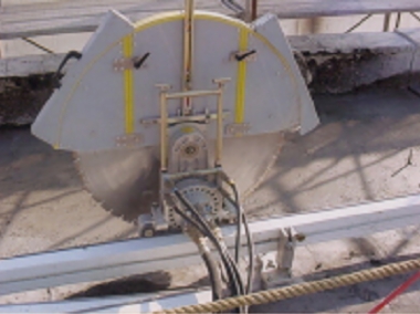 構造物壁面にレール固定で直線カットラインが可能です。大規模工事対応でエンドレスワイヤーにより橋脚からビル丸ごとの切断機を取り揃えています。