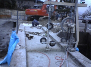 ダイアモンド砥粒を埋め込んだワイヤーをコンクリート構造物に巻きつけて切断する工法です。